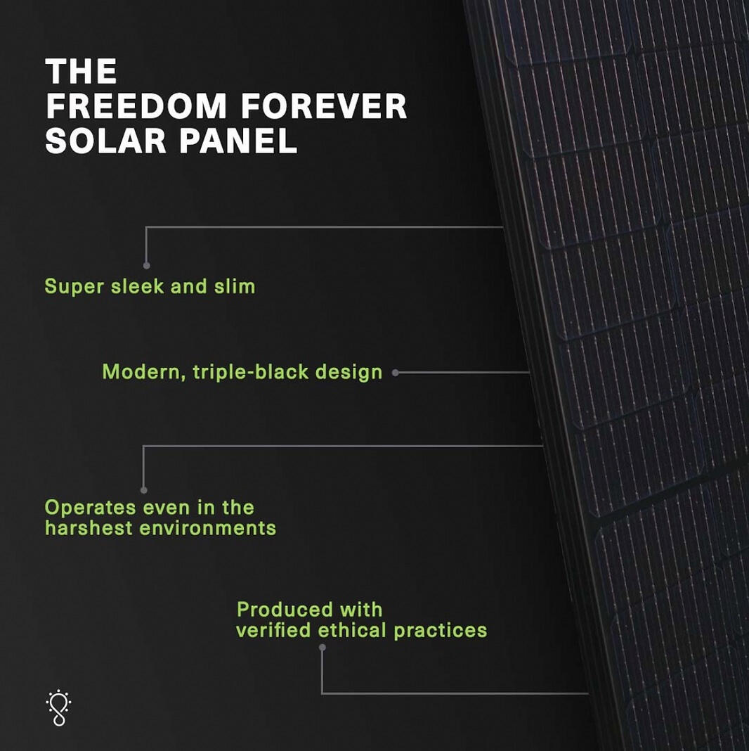 Solar Energy has come a long way in recent years. The Freedom Forever Solar Panel is the answer to a modern source of renewable energy.With its super sleek and slim dimensions and a modern, triple black design, your house will be the money-saving star of the neighborhood.Plus, our panel is compatible with all climates. That means it will perform in low temperatures, harsh rain and snow storms, and even in weak light environments!This is what Freedom looks like.